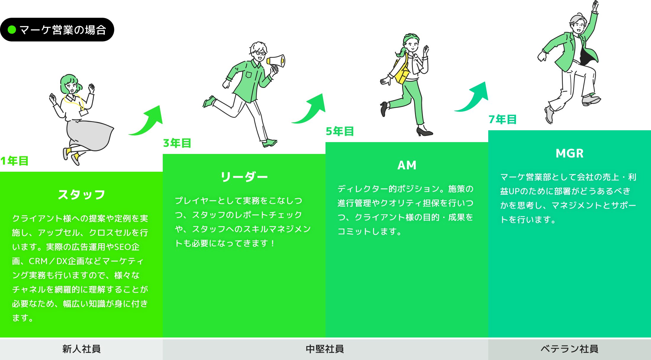 ※いきなり全てを行うわけではなく、メンバーが望むキャリアプランや得意な分野から着手できるよう仕事内容は調整していきます。
